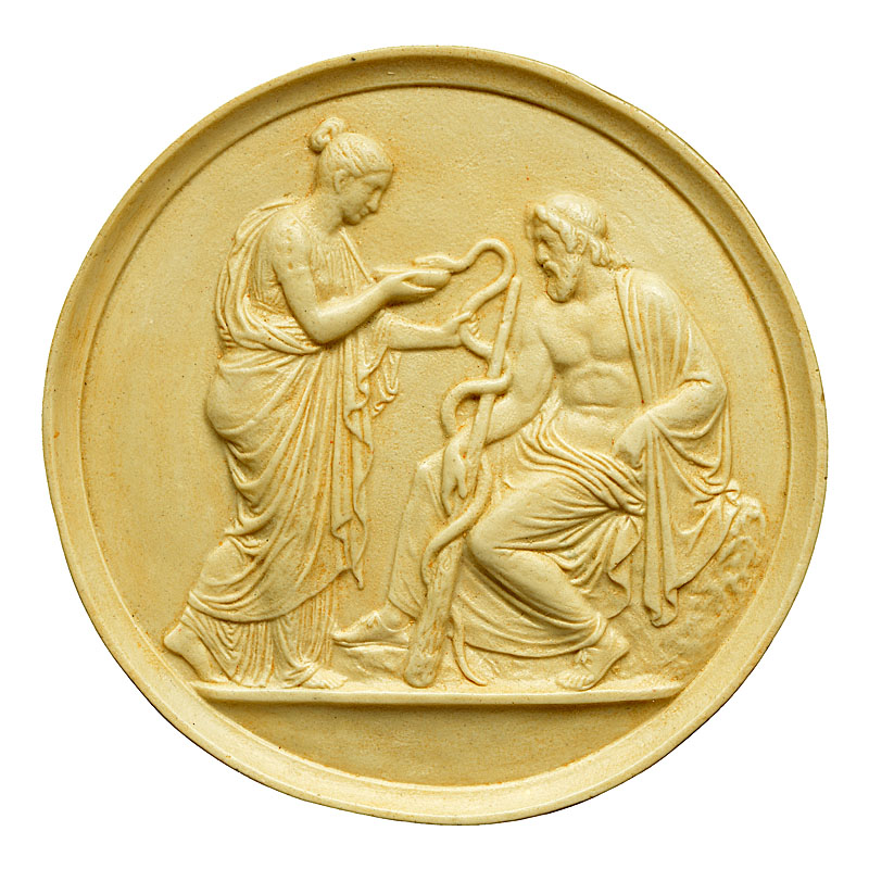 Asklépios byl řeckým bohem lékařství, který dokázal vyléčit všechny nemoci. Jeho dcera Hygeia, Dárkyně Zdraví, ho často doprovázela a pomáhala v obtížném úkolu navracet lidem zdraví v podobě harmonie na všech úrovních. Hygeia napájí hada, symbol moudrosti, který Asklepia vždy doprovázel.