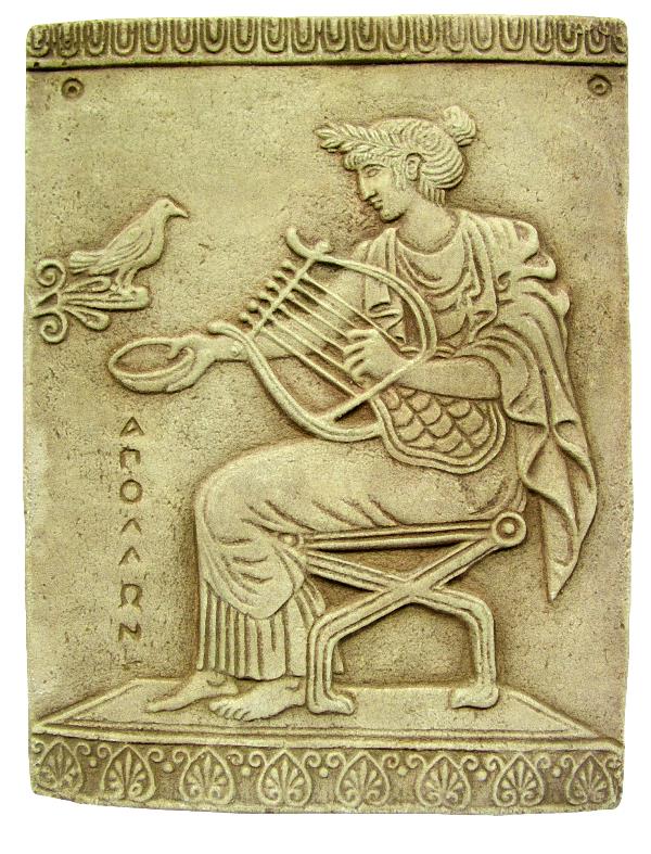 Apollón byl synem boha Dia a Titánky Léty. Byl bohem světla a slunce, ochráncem života a pořádku a rovněž vůdcem Múz - bohyní krásných umění. Tato umění sám provozoval a vynikal zejména ve hře na lyru. Reliéf byl vytvořen podle malby na dně číše nalezené v Delfách. Číše byla vyrobena kolem roku 470 př. n. l. a nyní se nachází v Archeologickém muzeu v Delfách.