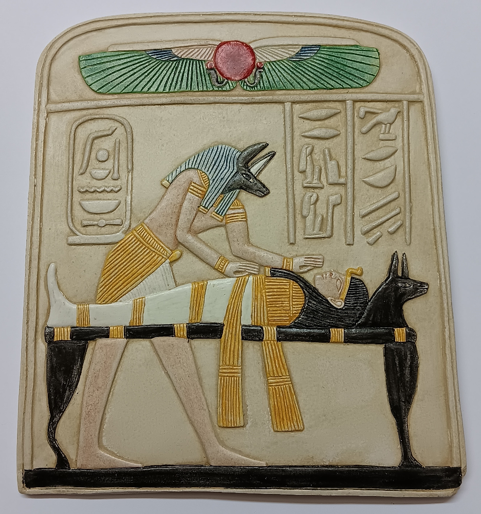 Reliéf pochází z 18. dynastie, z období vlády Ramessovců. Bůh Anubis, znázorňovaný v podobě šakala nebo černého psa, byl v Egyptě považován za vynálezce mumifikace. Provázel duši k posmrtnému soudu, při němž probíhalo tzv. vážení duše na vahách spravedlnosti. Anubis patřil mezi nejuctívanější egyptské bohy.