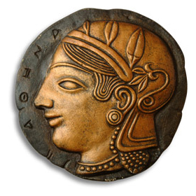 Athéna byla bohyní moudrosti a vítězné války, ochránkyní práv, spravedlnosti a umění. Chránila rovněž Athény (městský stát v Řecku). Podle řeckých tradic se zrodila z Diovy hlavy. Reprodukce představuje líc athénské dekadrachmy z roku 479 př. n. l.